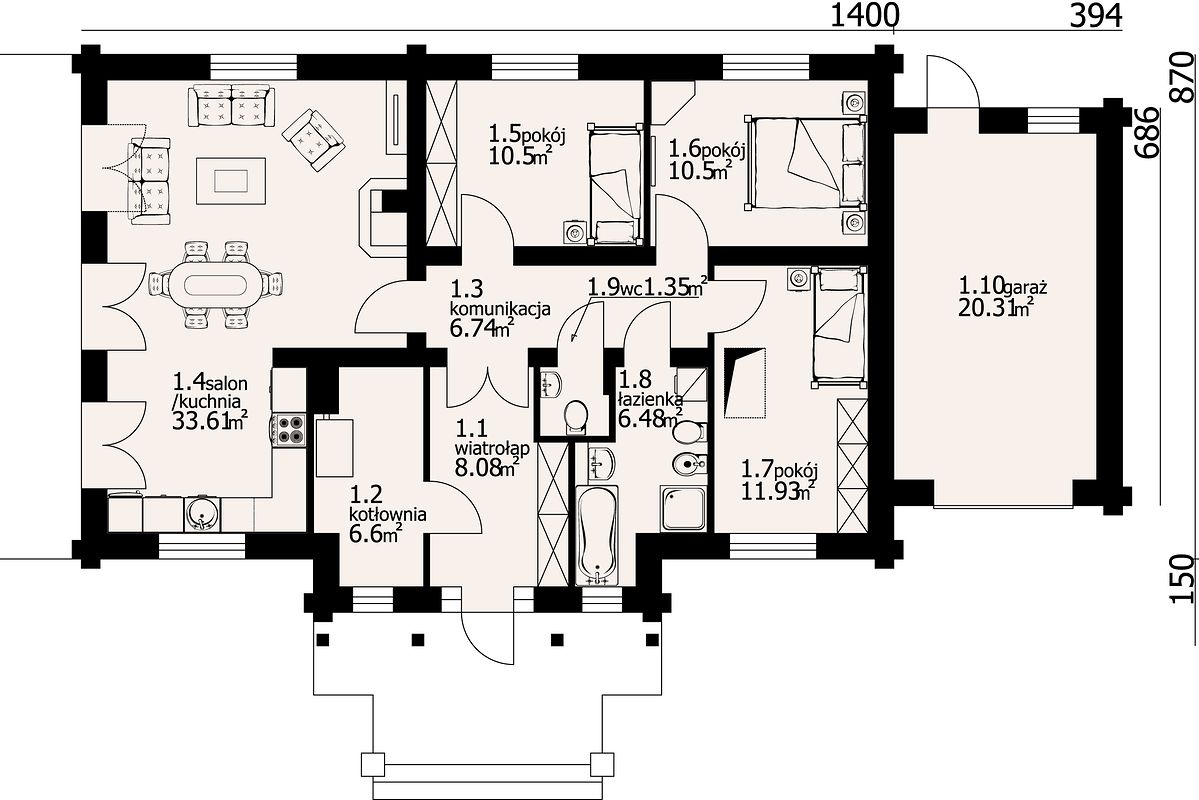 Къщата се характеризира с типична форма, която улеснява много по-късното подреждане на интериора. При този дизайн билото протича успоредно на пътя, което често се споменава в зонирането. Къщата е проектирана да бъде самостоятелна. Проектът може да бъде разположен на границата на парцела, така че може да бъде реализиран в двойна сграда. Дизайнът включва един гараж в линията на сградата. Освен това е чудесно предложение за хора, които търсят къща с двускатен покрив, което го прави евтино и просто решение. Проектът Chmielów 3 dw с гараж е едноетажна къща, което със сигурност е огромно предимство в случай на възрастни, инвалиди и семейни двойки с малки деца. Сърцето на къщата е просторна дневна зона, която благоприятства прекарването на време заедно с вашите близки. Състои се наред с други неща от функционална кухня, която ще сбъдне мечтата на всяка домакиня. Дизайнът включва удобна баня и отделна тоалетна, което е особено полезно за по-голям брой членове на домакинството. Къщата разполага с три удобни спални, което я прави отличен избор за семейство от 2-4 души. Пространството може да се използва и като стая за гости или офис.