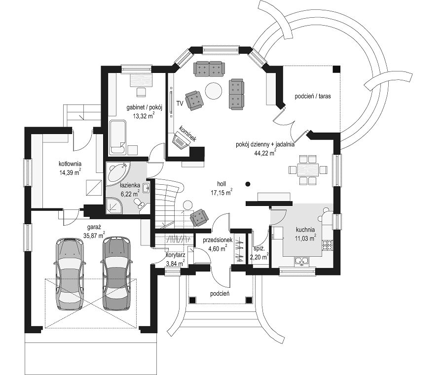 Проектът Maja 3 е едноетажна къща с таван, което означава, че използваемата площ не е ограничена от размера на парцела. Сърцето на къщата е просторна дневна зона, която благоприятства прекарването на време заедно с любимите ви хора. Състои се между другото от функционална кухня, която ще сбъдне мечтата на всяка домакиня. Всекидневната разполага с атмосферна камина, която придава приятна топлина и придава на интериора приятна атмосфера. Дизайнът включва две удобни бани – едната е на приземния етаж, а другата на тавана. Къщата разполага с пет удобни спални, което я прави отличен избор за семейство от 5-7 души. Пространството може да се използва и като стая за гости или офис.