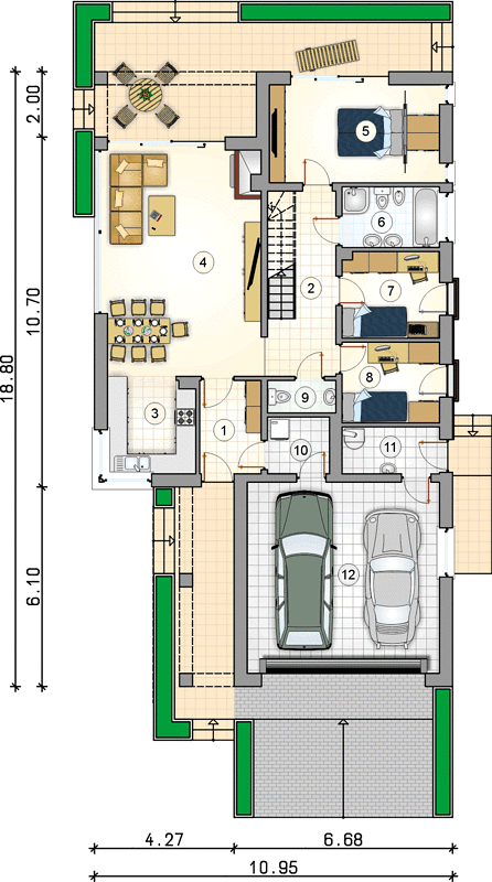 Планът на къщата GL-1086 Merlin IV е интересно предложение за хора с парцел със средна ширина. Къщата има типична форма, така че ще изглежда добре независимо от заобикалящата я среда. В този проект билото е разположено успоредно на пътя, което е много важно, когато строителните условия го изискват. Той е предназначен за инвеститори, които имат парцел, който дава възможност за изпълнение на проекта в самостоятелна сграда.
